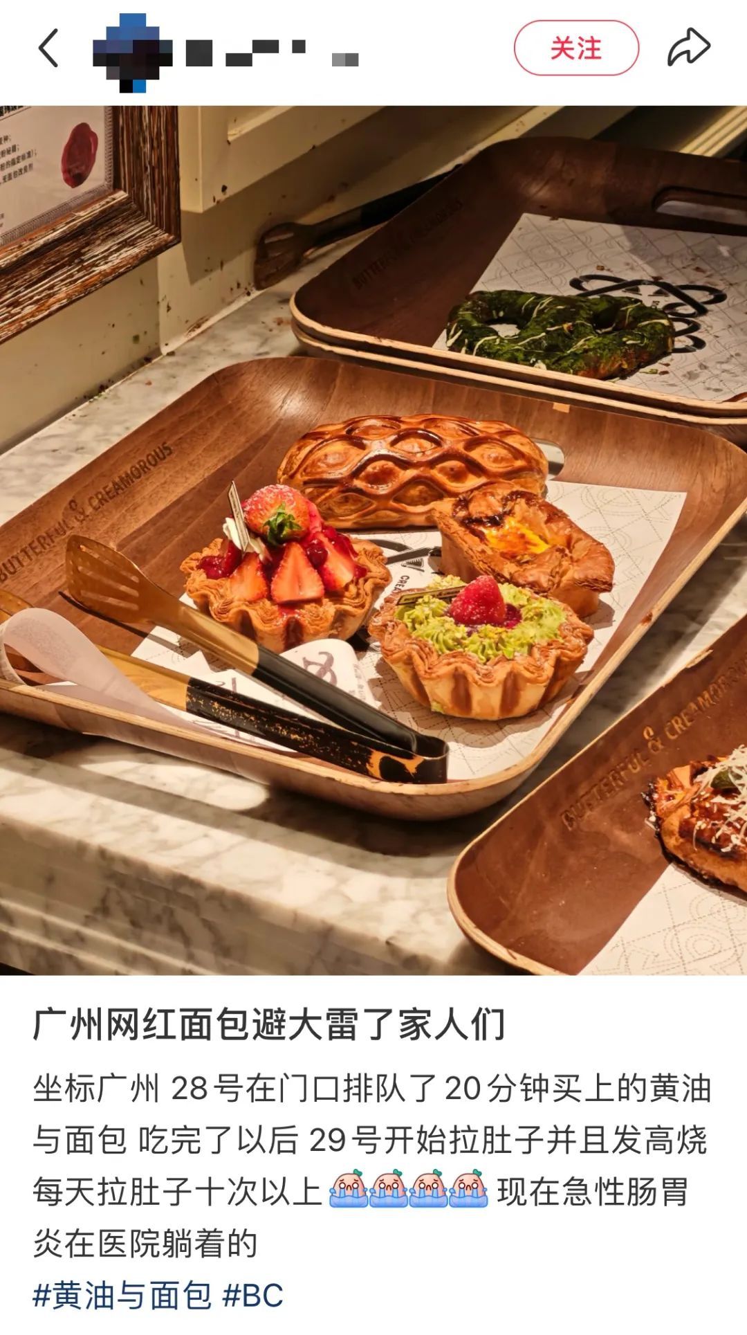 7月1日,多位市民发帖称吃过BUTTERFUL&CREAMOROUS黄油与面包广州首店(以下简称“B&C黄油与面包店”)面包后出现腹泻呕吐、乏力头晕、肌肉酸痛、发高烧等症状,有顾客诊断出细菌性感染急性肠胃炎。