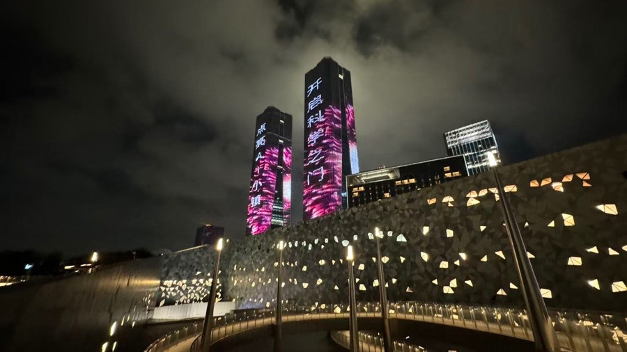 在张江科学之门双子塔,一场沉浸式光影秀《星河启明》以两栋高楼的立面为幕布,结合光影与科技,展现浦东创新创造、逐梦未来的精神。