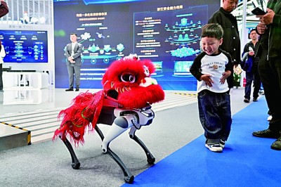 11月6日,“互联网之光”博览会,一名小朋友在与机器狗互动。光明网记者赵金悦摄/光明图片