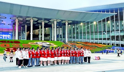 进博会志愿者在国家会展中心(上海)南广场合影。本报记者 杨雪丹摄/光明图片