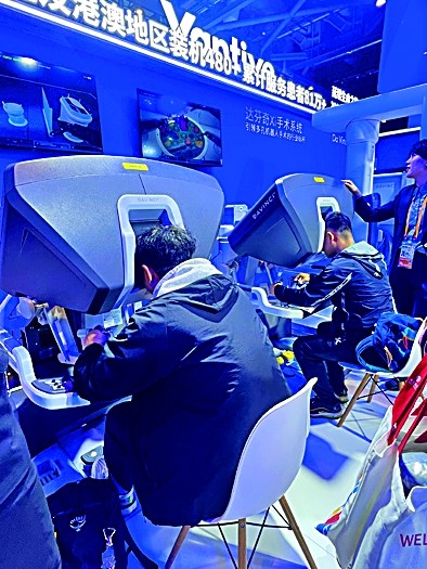 第八届进博会医疗器械展区,观众体验手术机器人操作。本报记者 刘梦摄/光明图片