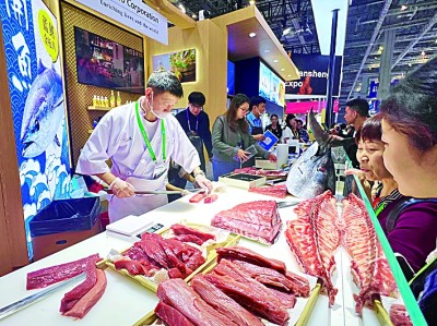 第八届进博会农食产品展区,工作人员现场制作金枪鱼刺身。 本报记者 刘梦摄/光明图片